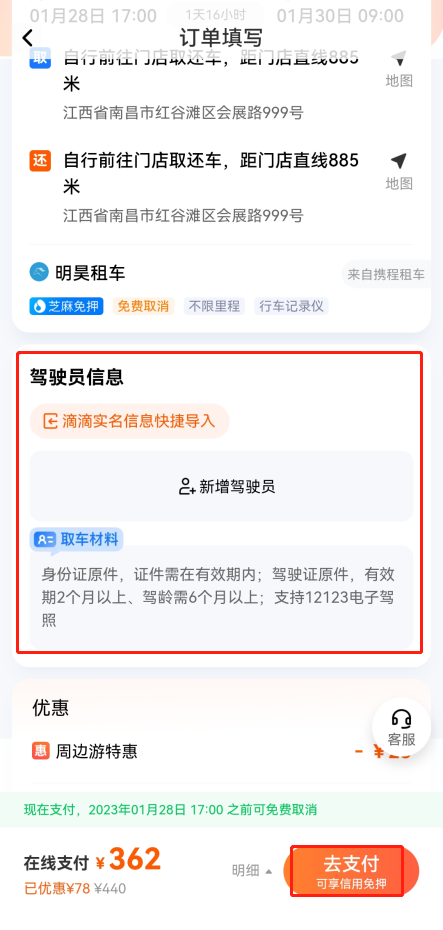 5、如果确定该车辆,用户还需要上传驾驶员信息,身份证和证件需要在有效期内,上传完即可去支付,支付后即可等车送上门或者上门去取;