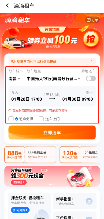 2、用户需要根据需求填写租车的城市、地点、时间、是否异地还车等等,填写完成即可点击立即选车;