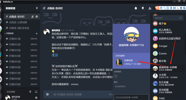 1、语音开黑 高质量的语音功能,稳定流畅,低占用,单频道内最多可允许25人同时发言。 2、实时组队 无论是LOL吃鸡还是彩六塔科夫,你都可以在这里随时找到一起玩的队友。 3、多端覆盖 覆盖多种设备,无论是移动端、PC端、网页端,只需通过邀请链接就可以实现语音的链接。 4、游戏内覆盖 不用分心辨别好友的声音,游戏屏幕的左上角会显示正在说话的用户(PC客户端支持)常见问题