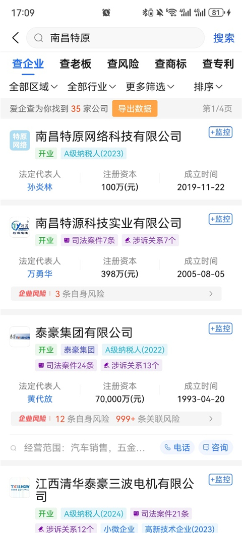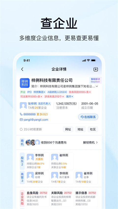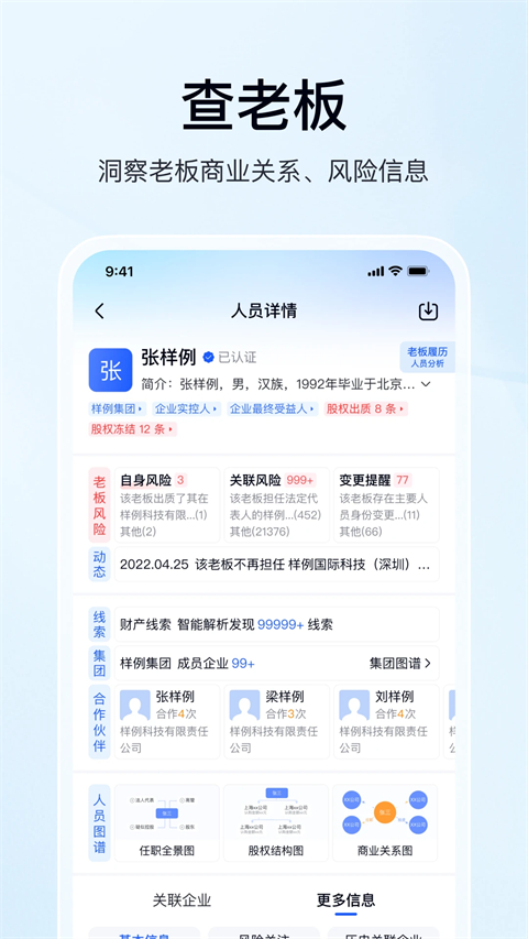 1、企业信息:工商、变更、股权结构、主要人员、分支机构、企业图谱等 2、企业风险:企业自身及周边风险,裁判文书、失信被执行人、失信人、开庭公告、法律诉讼等经营和司法风险 3、企业发展:融资信息、核心成员、企业品牌项目、竞品信息、投资机构等 4、老板信息:个人图片、商业角色、所有企业、合作伙伴等使用群体