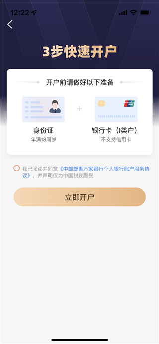 1、邮惠万家银行可以绑定微信支付宝使用,也可以转账给其他非绑定银行卡,日限额一万。但是入账只能绑定的银行卡转进去。 2、首先需要使用手机号码完成注册,然后点击立即开户。