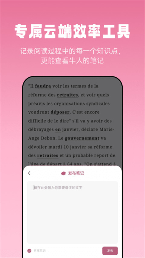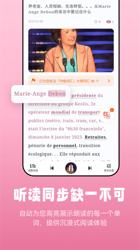 1、【体贴的操作方式】 - 创新的点词搜索功能,对文章中的单词即指即译 - 支持等级词汇高亮显示,显著提升单词量 - 支持等级词汇详解,提供翻译参考,阅读更高效 - 高亮标注《莱特法语学习背单词》里的词书单词,背单词和阅读听力同步学习,事半功倍 2、【与《莱特法语学习背单词》无缝集成】 - 《莱特法语学习背单词》是权威的法语学习背单词软件 - 支持口语练习,口语打分 - 支持生词本、学习记录自动同步 - 支持单词复习记忆功能软件功能