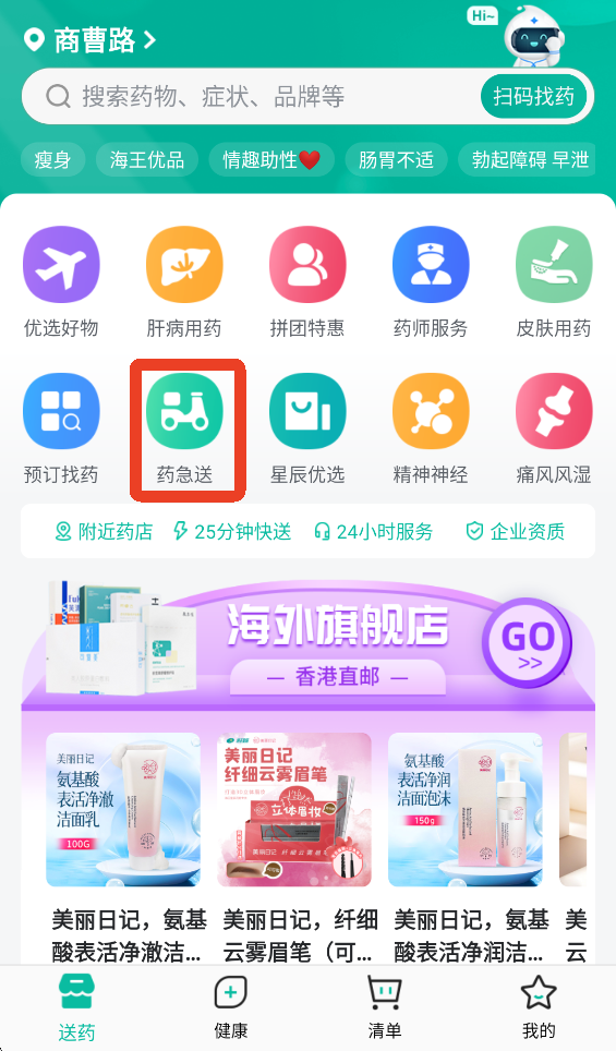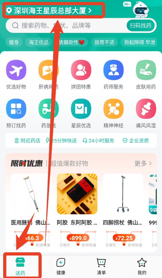 1、在【送药】界面点击【药急送】,如果你附近没有海王星辰药店是无法添加药品到药品清单的。