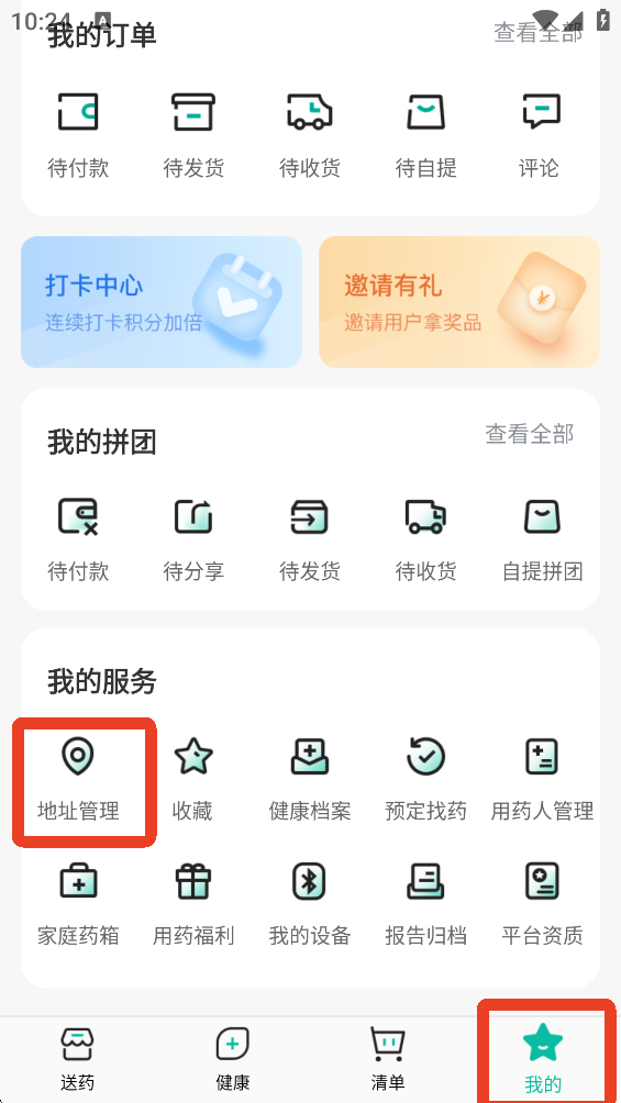 1、买药之前我们需要添加地址,方便后续买药。登录之后来到【我的】-【我的服务】,这一栏里有【地址管理】点击。