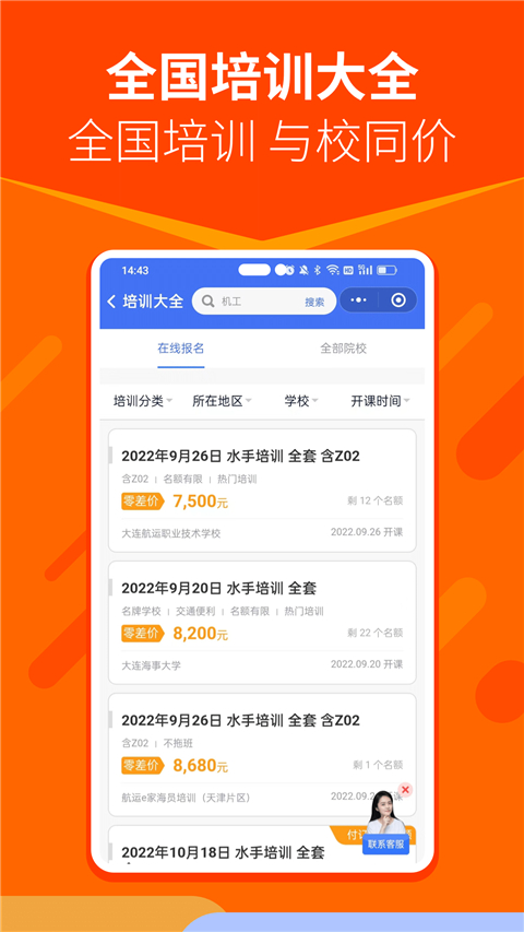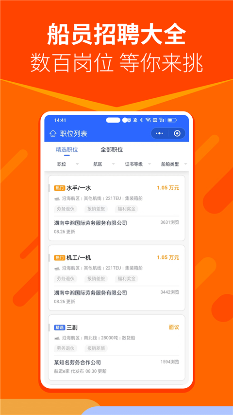 1、支持网上一键办理船员培训、办证。 2、校企合作、免中介费、职位精准匹配。 3、船舶、备件、物料在线交易,让买卖更简单。 4、随时随地,关注航运最新新闻热点、实时资讯。 5、船员考试成绩查询、船员证书查询、机构查询、BDI查询、潮汐查询、水位查询、台风查询、里程查询、实时船位查询、海洋天气。 6、首家企业直招的船员就业平台,仅需填写简历,专业客服帮你精准匹配职位!实时查看应聘进展,查收面试通知。更新日志