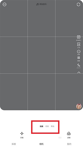 4、在拍摄框中间有闪光灯、倒计时、姿势、比例、模式和焦距等参数调整;