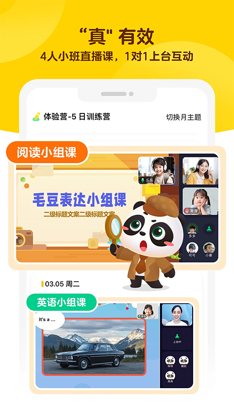 1、内容体系设计科学,学习目标贴合儿童潜能 -融合儿童语言发展要求,阶梯目标设计,螺旋上升。 -基础学习目标易达成,进阶学习目标有挑战,高层次目标激发潜能。 2、教学形式丰富多样,教学内容激发儿童兴趣 -课程内容丰富,选择不同阶段儿童熟悉并感兴趣的主题,丰富知识,开拓视野。 -课程设计精美,展示色彩鲜艳、形象生动的图片与视频,更易理解识记,提高审美能力。 -多元互动形式,利用现代教育技术,创设丰富的互动情境,打造沉浸式学习体验。 3、教学团队有趣有料,学习方法个性灵活多变 -课程研发团队由国内外名校毕业高校本硕领衔。 -小班AI直播教学,随时根据儿童反馈调整教学方法,结合儿童兴趣、爱好、性格进行差异化教学。更新日志