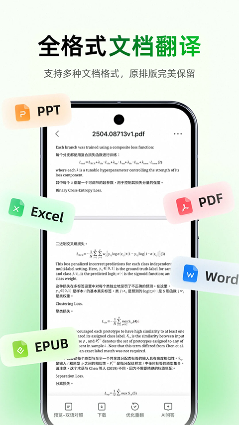 1、翻译语种 支持英语、日语、韩语、法语、俄语、西班牙语等18种语言互译,覆盖全球150+国家。 2、多种AI翻译模型 集成小译自研V4、V3模型,以及Deepseek、千问3、GLM等多种主流大语言模型,支持自由切换与场景推荐。 3、网页翻译 & 外文小说阅读 输入网址自动翻译双语阅读,轻松双语对照浏览外文网站与小说章节;特别优化外文小说场景;可将网页/小说内容一键保存到本地,即使网站失效也能安心阅读。 4、文档翻译 支持PDF、Word(.docx/.doc)、PPT、Excel(.xls)、EPUB等格式翻译。支持双语对照与仅译文版本预览和下载,支持跨设备访问与管理。 5、拍照翻译 支持拍照或从相册选择多张图片进行翻译,自动识别图片文字并提供译文,支持导出为文档或图片格式,翻译菜单、截图、海报更方便。 6、漫画翻译 支持从相册选择漫画图片、漫画PDF、漫画ZIP、漫画CBZ多种文件格式上传翻译,内置专属漫画翻译AI,轻松追生肉;支持导出为PDF、CBZ、ZIP文档到漫画阅读器中阅读或应用外分享。 7、语音和对话翻译 长按或一键点击说话,即可实现“边说边译”的实时传译,和面对面的对话传译。解放双手,自然交流,适合会议、出行、外语练习、问路、和出租车司机交流等场景。 8、自定义翻译风格 支持自建翻译风格,你可以轻松定义包括译文的语气、风格、场景和用词习惯,让翻译更贴近你的表达习惯;支持在翻译结果上动态调整翻译风格,快速获得更满意的译文。 9、术语库 内置10万+行业术语,同时支持个人术语库与专业领域术语库同步调用,实现更精准的专业术语翻译。更新日志