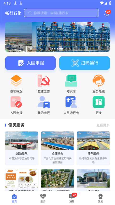 1、智慧园区 数字石化,开创产业新模式; 2、应用服务 一站式服务体验,您的贴身管家; 3、入园申报 人员、车辆、危化品车辆申报方便快捷; 4、智慧监管 数据监控,及时全面掌握。畅行石化功能介绍