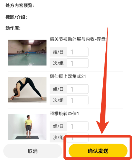 3、将运动处方预览区的内容发送给用户,可发送给已绑定的小程序用户。点击之后会跳转到【选择患者】页面,指定一个已绑定的患者进行发送处方,点击【发送患者】。