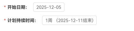 4、选择【开始时间】后,将在【计划持续时间】内自动计算周期内的结束时间。选择【开始日期】和【结束日期】默认单位为一周,可选择1周、2周.....20周,并自动计算出结束当天的日期。