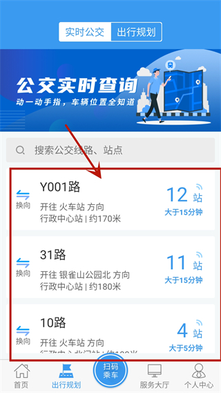 2、在出行规划页面可以查看当前位置的实时公交信息。
