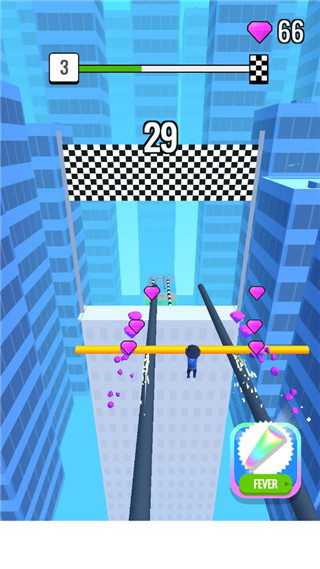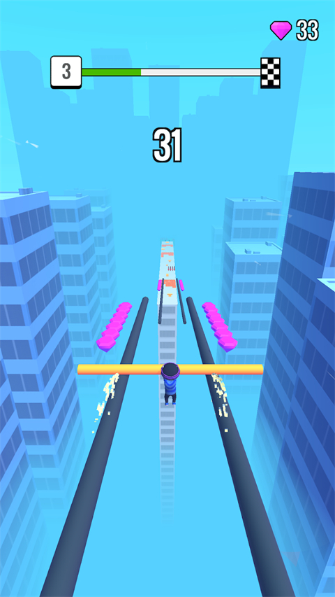 1、利用灵活的操作去跨越前方诸多的危险考验,你需要利用一根可以伸缩的棍子; 2、不断的往前奔跑,路途之中可以吃掉一些小短棍,去增加你的棍子长度,棍子越长; 3、你的生存几率也会越大,遇见更宽更大的沟都会不虚,找到合适你的节奏点,努力的向前冲锋吧。屋顶棍棍侠新手入门指南