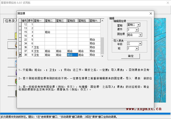 3、每周可设置固定课(班会、劳动 、卫生),可以是统一的(每个班都一样),也可有特例( 例如:某个班上“讨论”课,而别的班不上;某个班虽上“周会”但和别的班时间上的不一样)。