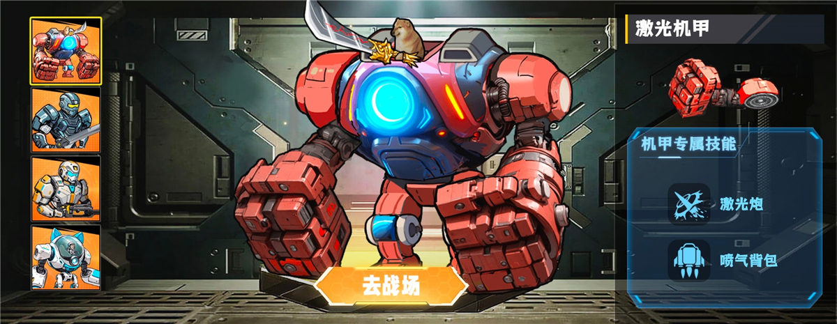 1、激光机甲 外观:红黑为主色调的大块头,胸口亮着蓝光核心,双手是厚重铁拳造型。