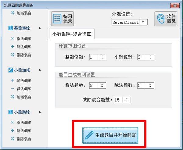 筑匠四则运算训练电脑版是一款适合于小学一年级至六年级的算术练习软件。该软件是一款能根据用户设置计算范围和算式模式的、随机的生成算式题目,并提供自动对练习进行评分、记录耗时;提供练习记录的保存,方便家长们和孩子们对练习状况进行回顾和分析总结。不论在日常出题、改题耗时耗精力方面,还是在孩子计算锻炼强度方面,有了该软件的辅助,都有非常大的改善。软件支持“连加”、“连减”、“余数”等等计算模式不论在日常出题、改题耗时耗精力方面,还是在孩子计算锻炼强度方面,都可以给孩子或者家长很大的帮助。有需要的朋友欢迎前来下载。