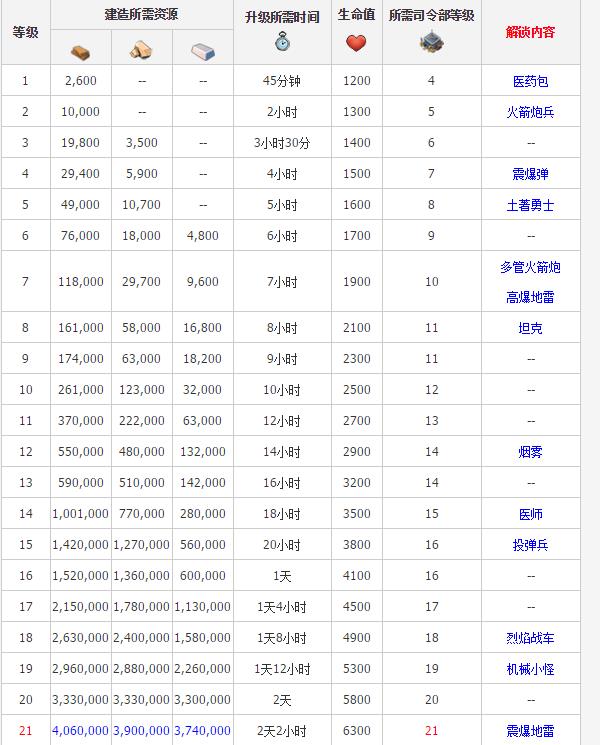等级从1到21,其中包含了建筑所需资源、升级所需时间、生命值等。