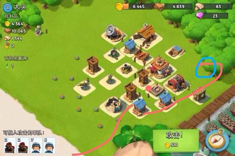 这玩家情况就是大部分防备建筑物都在前面本后面无防备,可以用胖子配合mm跟着红色路线走不打任何防备走到本后面偷本了。