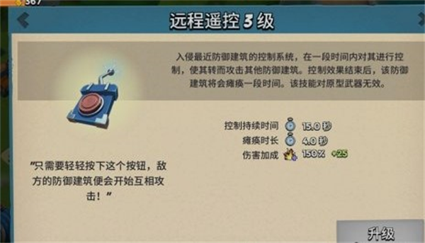 3、远程遥控,升级控制防御建筑的伤害值,技能很确实很牛逼,毕竟控制建筑主要作用是吸引敌方火力,干扰对方攻击,这个升级后伤害不是很可观,建议满了机器小怪技能的后期进行升级!