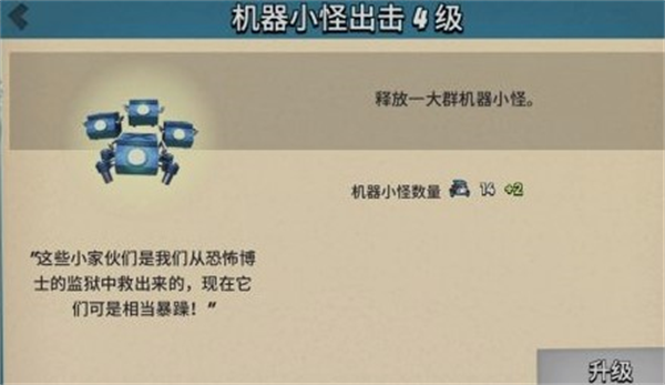 2、机器小怪,升级小怪数量,相当于减少一部分战舰机器小怪投放能量,缺点就是不能随意投放,对付单攻建筑,保护部队方面很有帮助,建议升级优先级推荐!