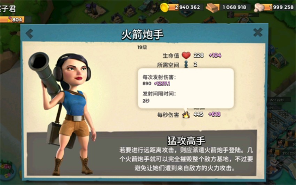 胖妹前期容错率高,15本之前一般阵都能打,高血量的胖子作为肉盾兵种,拥有极厚的血量,掩护性能非常优秀;火箭炮手攻击距离远输出高,可以利用高输出平推对手的防御,胖子主要在前方扫除路障,吸引火力,妹子随后摧毁敌军防御,最终攻占海岛,肉盾加输出兵种,推人强力,能量和雕像需求较低,受到很多大神的青睐,利用好了简直无敌。