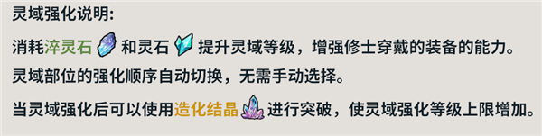 2、每件装备都含有特殊的天地灵气,道友们操控的修士也需要对装备进行灵域强化方可发挥其更大的作用,每个部位的装备进行灵域强化后都可以使得佩戴者发挥其更高的实力。