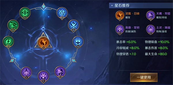 蓝绿星石选择暴击、爆伤、冷却缩减和物理吸血,配合黄忠的被动暴击,提高黄忠的消耗能力。紫色星石推荐天鹰,青藤,土灵,保证保证生存和良好发育的同时,提升终结伤害。橙色星石选择灵狐,进一步增强消耗能力