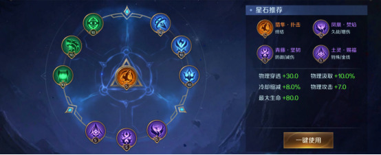 蓝绿星石主要是物理穿透、物理汲取和冷却缩减为主。紫色星石推荐蛟龙,苍木,雷灵,提升持续作战能力续航,橙色星石选择猎隼,加强其爆发输出能力。