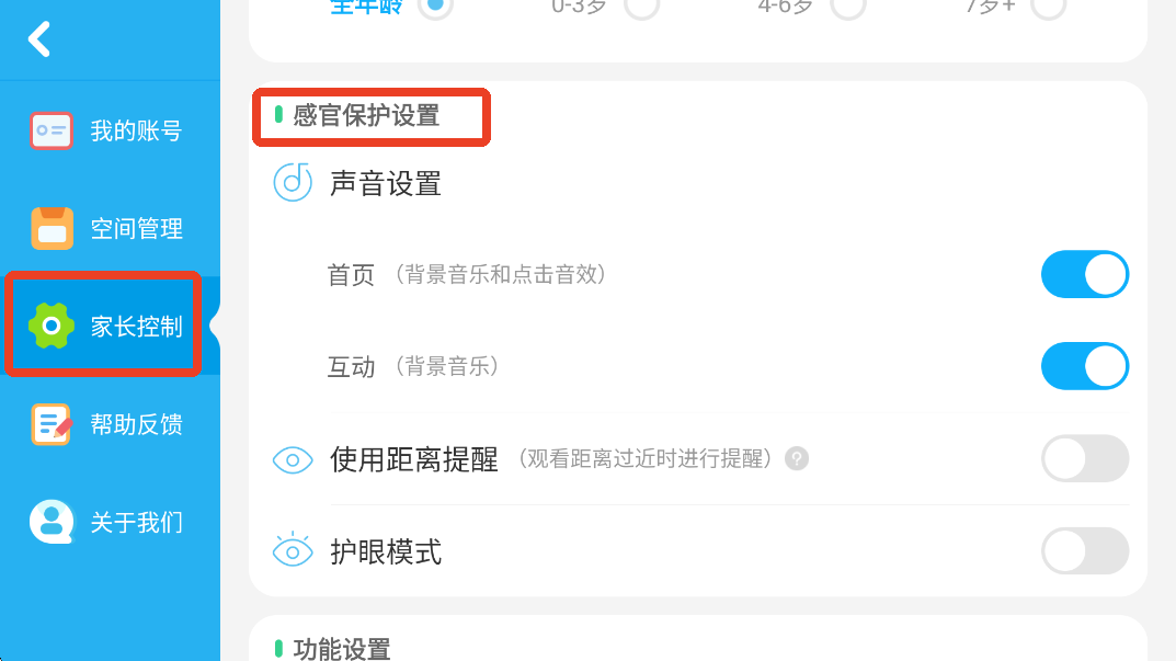 3、点击左边的家长控制,下滑找到感官保护设置。