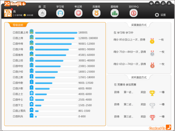 1、我的个人资料数据说明 (1)经验值:在3E上的任何学习过程都会获得不同量值的经验值,得分越高经验值越高,经验值不清零,永久性正累积。 (2)E币:使用3E学习过程中根据取得的成绩以及不同的学习模式会获得不同量级的E币,金币可不断累积不清零,未来将会增加E币兑换功能。 (3)奖牌:3E口语分为金牌、银牌、铜牌三类奖牌,短文朗读以及短文复诵取得85分(含)以上可获得一块金牌,75分(含)-84分可获得一块银牌,65分(含)-74分可获得一块铜牌。 (4)奖杯:参加3E举办的任何口语比赛,获得前三名即可获得金杯、银杯或者铜杯,获得其中任何性质奖杯即可累计一个,参加的比赛越多获得奖杯的机会越多。 (5)口语等级:口语等级的进阶规则详见点“击用户头像——我的空间——我的荣誉——等级说明”。