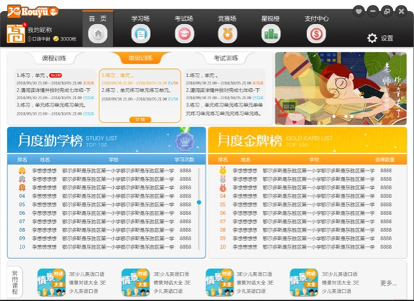1、学生 3E口语智能学习平台是学生通过自主性学习提高英语听说能力、逐步适应英语考试改革的智能家教,是帮助学生提高英语综合运用能力的智慧学习平台。 2、教师 3E口语是为老师提供英语听说教学的辅助工具,是45分钟课堂教学的延伸,是帮助老师逐步适应教改,考改的智慧教学平台。 3、家长 3E口语智能学习平台是家长辅导孩子英语学习的家教、能够及时准确了解孩子英语学习情况的帮手,是解决家长指导孩子英语烦恼的智慧辅助平台。五大学习模式介绍