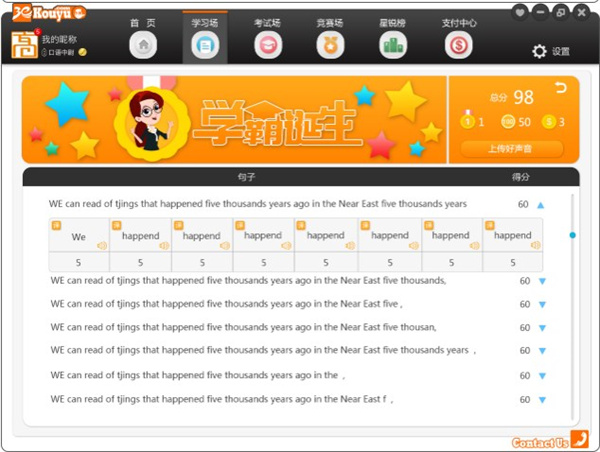 3E口语智能学习平台是新一代的英语智能语音听说训练学习平台,提供单词练习、逐句跟读、短文朗读、短文复诵、智能对话等五大学习模式。能够精确指出每一个单词、音标存在的发音问题,采用智能评分引擎,在练习的过程中实时、准确的评测学习者的发音, 从准确度、流利度、完整度三个维度去分析学习者的口语能力并反馈成绩,评分精确、高效、权威,逐单词、逐句子精确指出口语存在不足的地方,从基础指导学习者,并提供有效改进建议,让学习者在短时间内轻松提高英语听说能力,彻底解决 “ 哑巴英语 ” 问题。规则数据说明