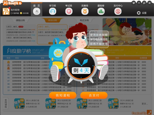 1、首次登录注意事项 默认密码统一为:"123456"(登录后请及时前往"设置——修改密码") (1)3E账号字母不区分大小写; (2)老师请选择"老师使用"、学生请选择"学生使用"; (3)在常用地点登录可勾选"记住密码"功能. 2、提示用户不存在的解决办法 请您仔细核对账号:首字母不区分大小写,字母后均为数字,请勿将数字0输入为字母O. 3、提示登录后提示用户名或密码错误 请您再次核对输入的密码是否正确,是否已修改过密码(默认密码为123456).如仍提示错误,请在登录页自行重置密码(需绑定过手机号),或准备好账号信息联系3E客服重置密码. 4、服务到期提醒 表示您的服务即将到期,到期后各终端"学习场&单词场"将不能继续使用,需要您前往支付中心通过微信或支付宝进行支付后,继续使用全部功能.另外,微信关注3E口语家长通公众号,绑定孩子3E账号后,也可在"个人中心——我的支付"中进行支付.