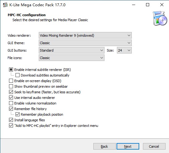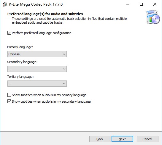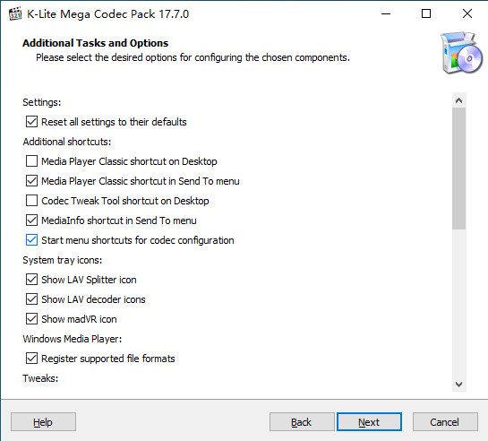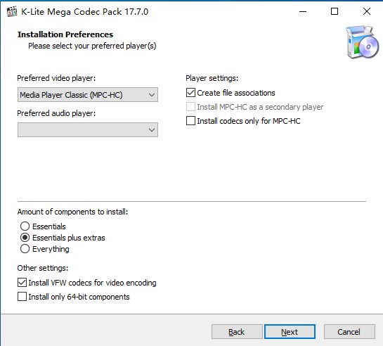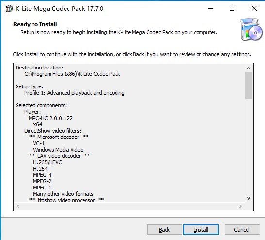 与完整版相同,加上: 一些 ACM/VFW 编解码器,例如 x264VFW 和 Lagarith 某些视频编辑/编码应用程序使用此类编解码器来处理 AVI 文件。例如 VirtualDub。 视频播放不使用或不需要这些类型的编解码器! 低音音频源 用于解码 OptimFrog 和 Tracker 音频文件(非常罕见的格式)。 MPC 图像源 用于在 DirectShow 应用程序中显示图像格式。 GraphStudioNext 用于创建和测试 DirectShow 图形的工具。 ffdshow 音频处理器 DirectShow 过滤器,提供一些音频处理选项。默认情况下不使用。也不需要或推荐。 ffdshow 视频处理器 DirectShow 过滤器,提供一些视频处理选项。默认情况下不使用。也不需要或推荐。K-Lite Mega Codec Pack中文版安装教程