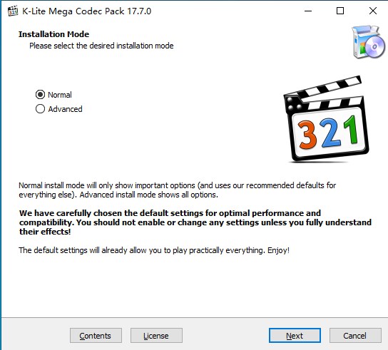 1、下载解压出文件,点击K-Lite_Codec_Pack xxx.exe开始安装; 2、K-Lite Mega Codec Pack提供了2种安装模式供用户使用,从上到下为一般模式(Normal)、高级模式(Advanced)根据选择的模式,安装的内容会有较大的区别,越是高等级的模式安装的内容就越多,普通用户选择一般或是高级模式就能几乎满足所有的需要。