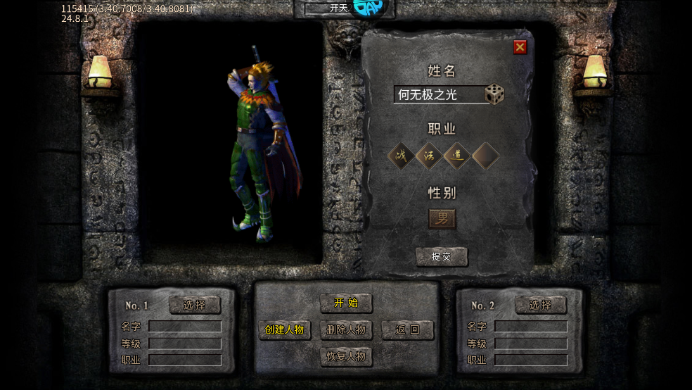 1、角色选择 玩家本站下载并打开游戏之后,会进入到角色创建页面,玩家可以在战士、法师、道士三个角色内选择一个自己喜欢的角色进行创建。