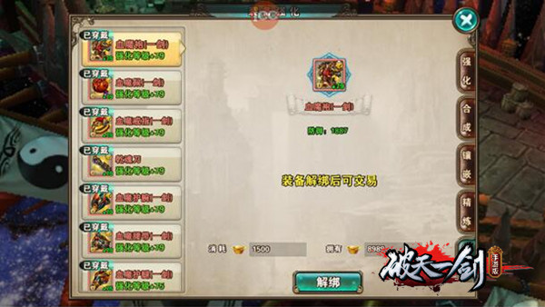 当然,在绑定装备的同时也可以对已绑定装备进行解绑,解绑页面在装备强化页面中可以找到,解绑装备需要消耗一定的非绑定元宝,消耗元宝的数量会根据装备的合成等级变化,合成等级越高的装备,在解绑装备时会消耗更多的元宝。