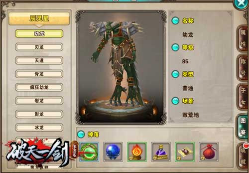 一、新怪物图鉴 辰灵现世,寻龙对决上九天!《破天一剑》手游“辰灵现世”正紧锣密鼓的准备中,在新资料片上线之前,就先让我们来了解一下新开放的“辰灵星”上的生态,了解一下所有怪物的特性,为版本开启后能够冲刺在第一线战斗做好准备! 1、激战败荒地 玩家自辰灵山庄出来,便是一片蛮荒地败荒地区域,这里的敌人等级主要分布在85~90级之间,敌人以幼龙和刃龙为主。这两种怪没有什么特殊技能,以普通攻击为主,但玩家也万万不可大意,辰灵星上每一个怪的实力都不可小觑!