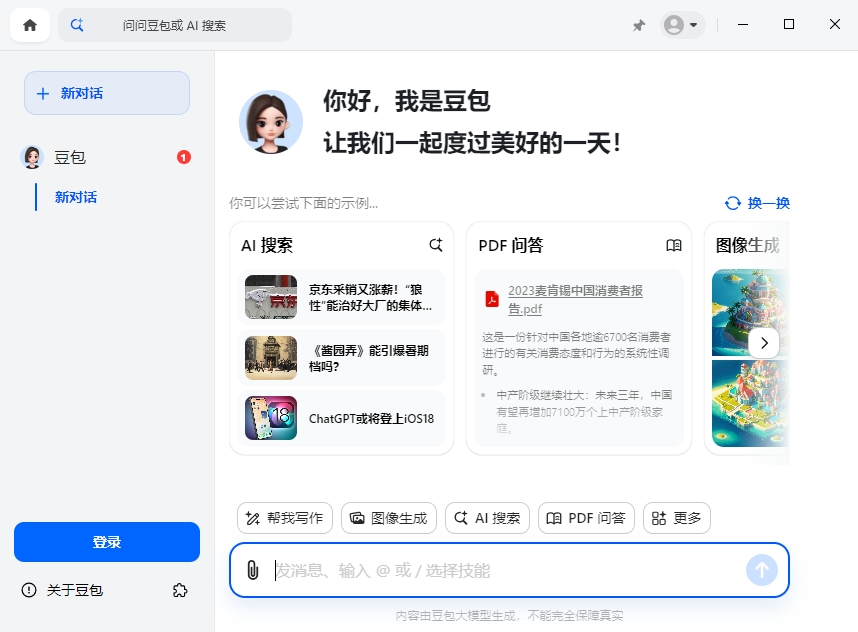 豆包AI电脑版是一款智能AI工具,它提供了AI搜索、PDF问答、图像生成、帮我写作、智能问答等功能。相比于豆包手机App而言,抖音豆包PC客户端显得更为高端智能,因为她能让你在电脑桌面上随时随地都能用上AI,直接提供选中文字翻译、AI搜索、解释功能,并且,您只需单击一下就能搜索整个互联网,无广告,快如闪电,精准无比!