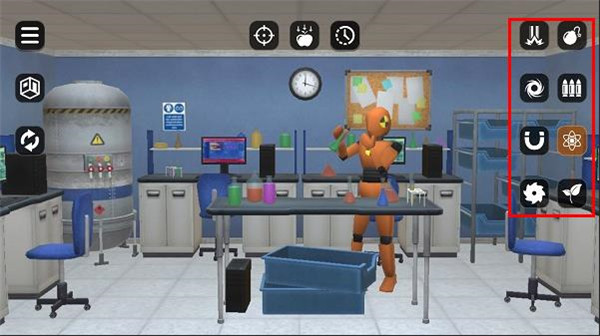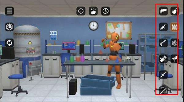 3、中心位置,显示的是瞄准、重力控制,以及时间,右侧内容就比较丰富啦,直观的展示分别是炸弹、子弹、量子和植物,其中在炸弹图标隐藏功能里,分别有不同类型的炸弹可以选择,如手雷、燃烧瓶等。