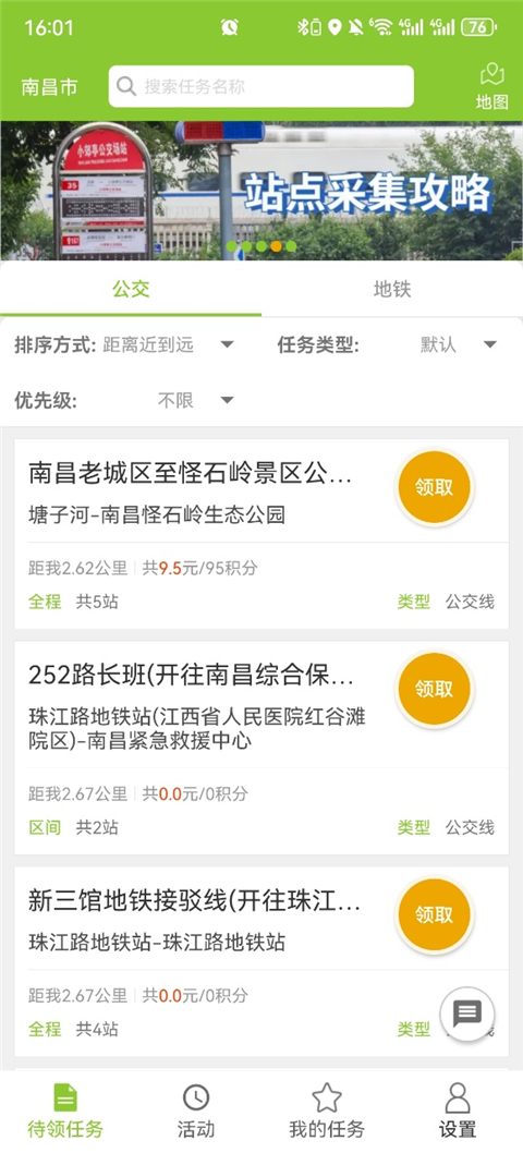 3、接下来,开始采集站点的任务,这是在你坐上公交车以后,每到一站,你点击一下采集就可以啦,不需要拍照的;