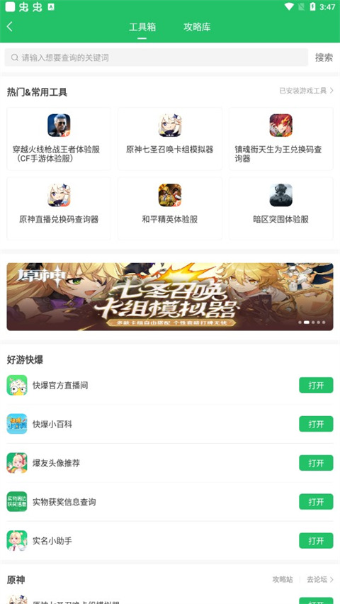 1、海量攻略:新手热门、高手进阶、战斗技巧、通关秘籍。 2、实时资讯:精彩专栏、热门新游、vr游戏、行业资讯; 3、解说视频:真人解说、通关技巧、新游宣传; 4、工具箱:有球球大作战、阴阳师等热门游戏实用工具! 5、好游推荐:每天推荐一个精品游戏,大家一起试玩鉴定; 6、攻略大全:覆盖游戏最全的原创攻略库。更新日志