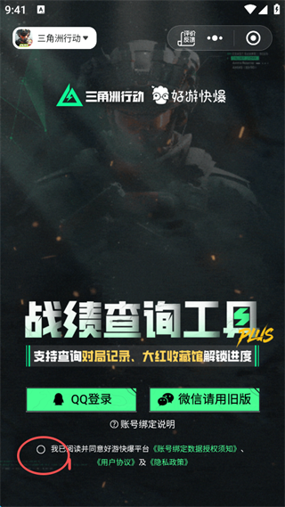 5、勾选“我已阅读...”,根据需要查询账号,决定登录QQ还是微信。