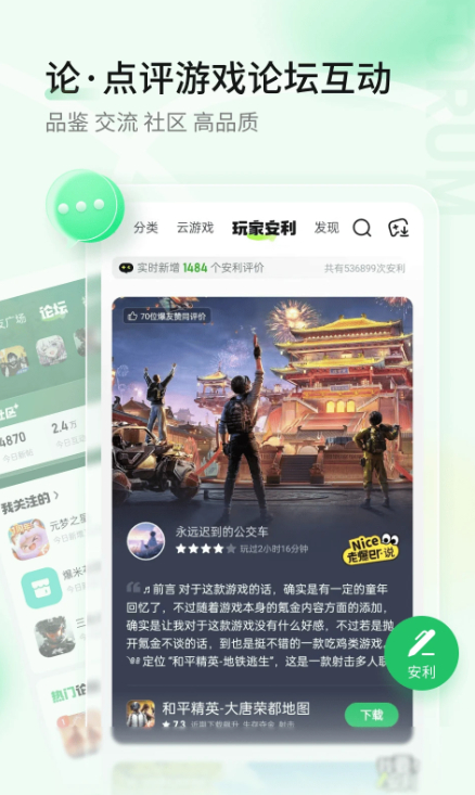 1、用户口碑赞誉 用户积极评价平台提供的游戏推荐和内测资格,认为是发现精品游戏的好途径。 2、社区互动热烈 游戏社区内用户互动频繁,分享攻略、心得,形成良好的社群氛围。 3、智能推荐准确度高 用户反映推荐的游戏更符合个人兴趣,提高了游戏体验。 4、福利活动受欢迎 独家活动和福利得到玩家认可,用户喜欢通过平台参与活动获取额外奖励,增强了用户黏性。更新日志
