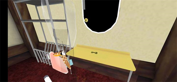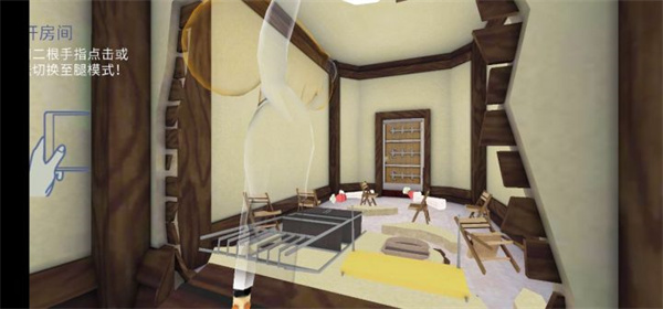 3、拿上垫子清空后桌子出现的钥匙,用钥匙打开橱柜,两根手指划动抬起手臂,钥匙对准孔之后再次点击就可以开启,要打开两个孔;