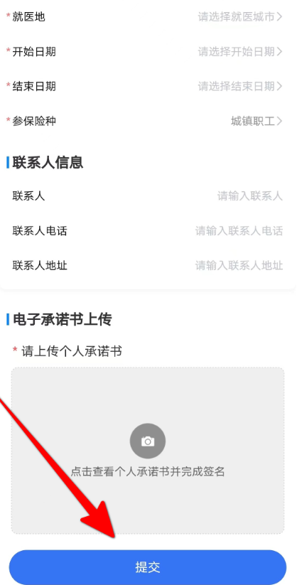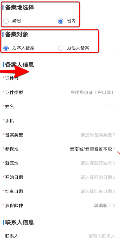 3、开始进行信息登记备案,选择【省内】,填写异地就医备案登记信息,带“*”项为必填项,置灰项根据已有信息自动导入,不能填写,只能查看,其他为选填;上传【电子承诺书】,点击【提交】可以提交保存填写的省内异地就医备案登记信息(可以自己办理,也可以为他人代办异地就医备案。)。