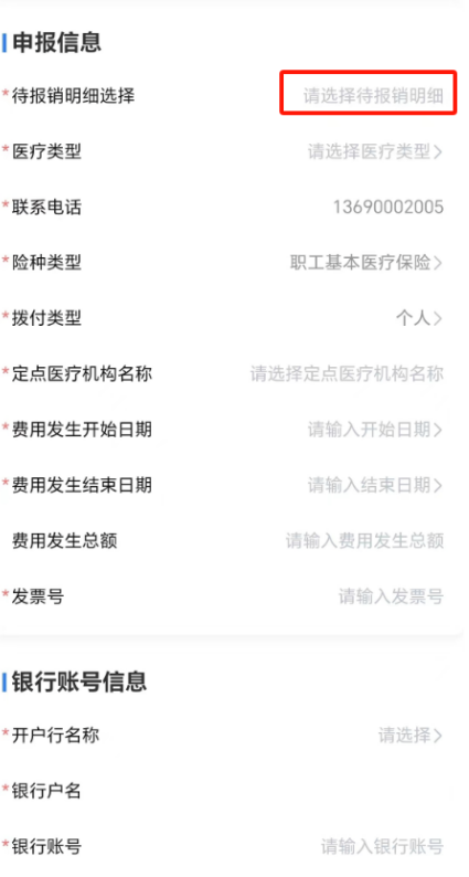 3、选择待报销明细,带“*”项为必填项,置灰项根据已有信息自动导入,无需填写,其他为选填;点击【提交】可以提交保存填写的报销信息。