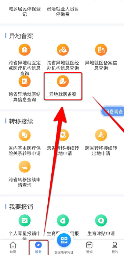 1、点击【服务】进入办理页面;点击【异地就医备案】;