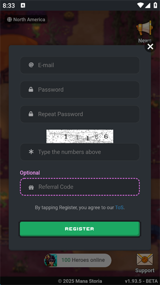 2、依次输入,邮箱号,密码,再次输入密码,随后填入验证码,推荐码可填可不填,随后点击“REGISTER”,就可以直接进入游戏了。