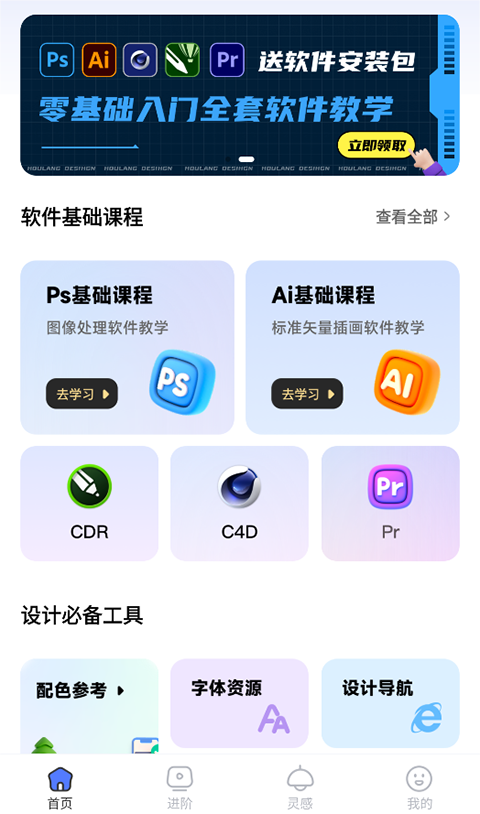 【入门教程】 -Ps图像处理软件零基础入门全套教程 -Ai标准矢量插画软件零基础入门教程 -Pr视频剪辑后期处理软件零基础入门教程 -CDR矢量绘图与排版平面设计软件零基础入门教程 -C4D大型三维图形渲染制作软件零基础入门教程 【设计工具】 -设计网站大全 多个知名设计网站导航,按类检索,直达创意汇集中心。 -软件快捷键 一键快查询各类设计软件的常用快捷键组合。 -海量配色 拾取缤纷好色彩,解决你的配色难题,汇集多套配色方案,如:传统配色,潘通色,油画配色,软件应用配色,经典配色等。 -软件插件 涵盖多款设计软件的实用插件,提高你的设计效率。 【设计灵感】 -迸发灵感源泉 探索设计美学、汲取设计灵感、捕捉生活美好、构造视觉创意、提升专业审美。 -精选视觉创意 汇聚多个好的视觉创意方案,行业优秀模板素材,覆盖各行各业设计需求,轻松满足各类宣传所需。 -拓宽设计视野 了解行业新的设计趋势、设计软件、设计技巧,以及优质创意方案。 【鉴赏点评】 -我们鼓励原创、鼓励优秀设计作品分享到我们的共创平台,届时我们将有专业的设计大拿在线点评作品,给予专业的设计建议与指导。你的作品更有机会上App榜首,获得全平台首页展示和曝光,提升你的设计知名度! 【设计资料】 -涵盖字体设计、品牌vi手册、logo设计、IP形象、C4D白模、oc材质球、电商促销场景海报、UI设计、平面设计、艺术设计、广告设计、电商设计、包装样机、海报排版设计模版等等…这里有设计相关的全类资料任你拿。后浪学设计app获取资料教程